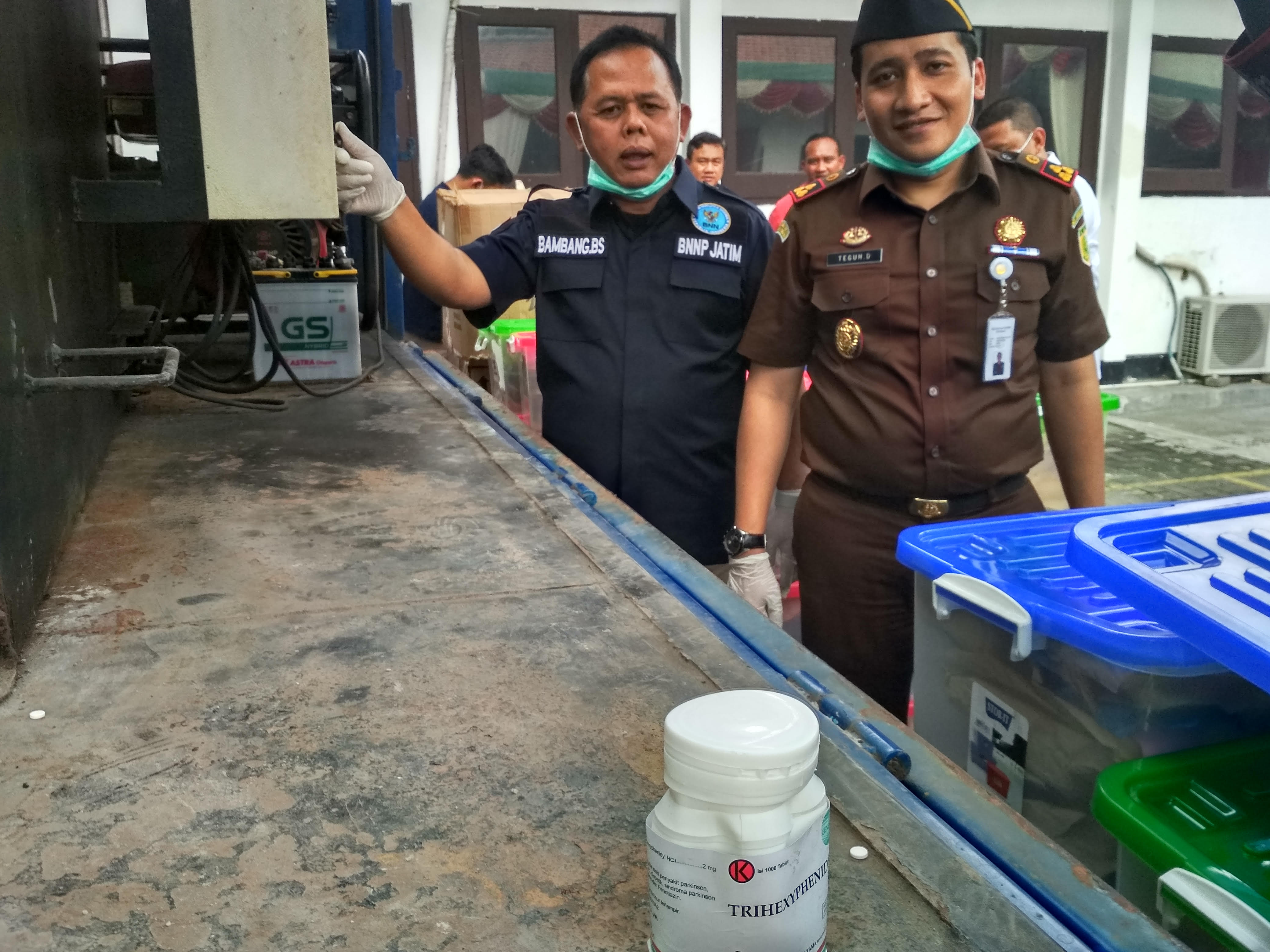 Pemusnahan Barang Bukti (BB) Narkotika dari Kejaksaan Negeri (Kejari) Surabaya menggunakan mesin incinerator milik BNNP Jatim. BB yang dimusnakan berkekuatan hukum tetap (inkracht) yakni 23.902 butir pil logo Y, ineks 6 butir, pil Happy Five 126 butir, 6.319 butir pil DMP, 19.116 pil Dextro, 13.439 pil G, 325 alat-alat narkoba dan 2.395 lembar uang palsu. Uang palsu itu terdiri atas pecahan Rp 20 ribu 266 lembar, Rp 50 ribu1913 lembar dan Rp 100 ribu 219 lembar. Acara ini dihadiri Kepala Kejari Surabaya, Mohammad Teguh Darmawan, didampingi Kepala BNNP Jatim, Brigjen Pol Bambang Budi Santoso beserta jajaran dan tokoh masyarakat, Kamis (11/1/2018).