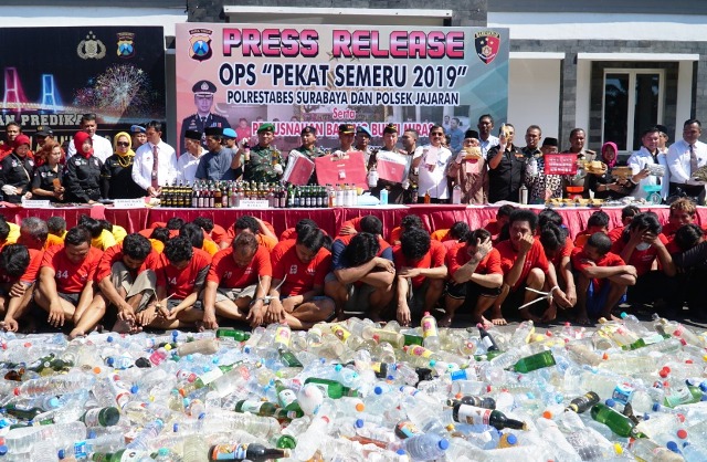 Potretkota.com - Polrestabes Surabaya mengelar hasil ungkap Operasi Penyakit Masyarakat (Pekat) Semeru 2019, serta pemusnahan barang bukti minuman keras (miras) tak berdokumen.
