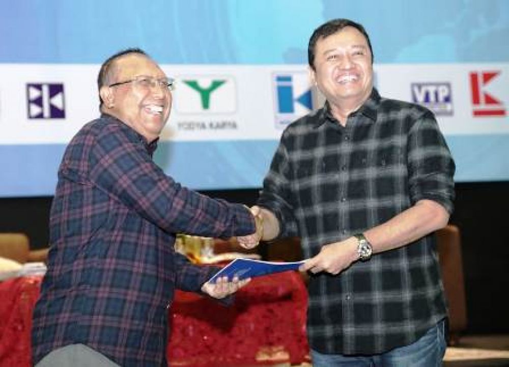 Deputi Bidang Usaha Energi, Logistik, Kawasan, dan Pariwisata (ELKP) Kementerian BUMN, Edwin Hidayat Abdullah, memberikan Surat Keputusan Menteri BUMN terkait penunjukkan tersebut ke Ahmad Bambang di sela Rapat Kerja Kementerian BUMN di Yogyakarta, Jumat (20/9/2019).