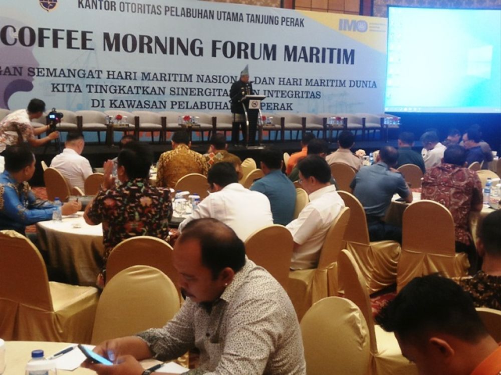 Potretkota.com - Dalam memperingati hari maritim nasional dan Internasional, Kantor Otoritas Pelabuhan Tanjung Perak mengadakan 'Coffee Morning Forum Maritim' guna mensinergikan antara pihak Otoritas Pelabuhan (OP) Tanjung Perak Surabaya dengan para pengusaha yang bergerak di transportasi laut.