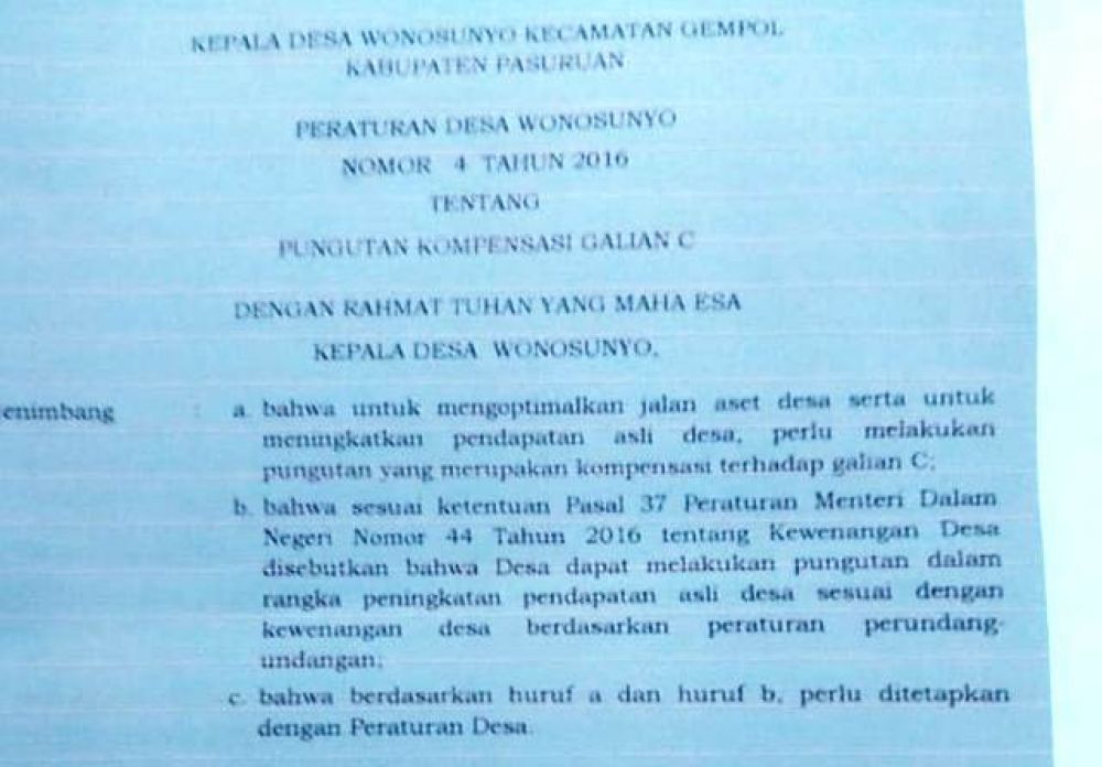 Potretkota.com - Peraturan Desa (Perdes) tambang yang terletek di Dusun Betro, Desa Wonosunyo, Kecamatan Gempol, Kabupaten Pasuruan mendapat sorotan. Pasalnya Perdes tersebut ada yang mengganjal dan tiba-tiba muncul tanpa mengetahui pihak-pihak yang terkait.