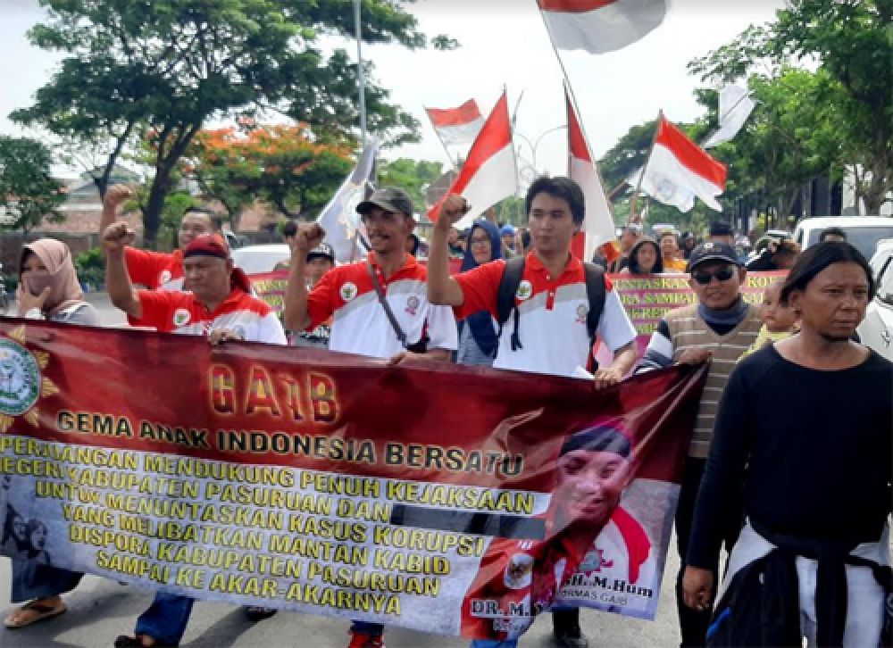 Ketua umum LSM Gema Anak Indonesia Bersatu (Gaib) Yusuf menyatakan, kami bersama sejumlah masa datang ke kantor kejaksaan negeri Bangil, intinya memperjuangkan dan mendukung penuh kejaksaan untuk menuntaskan kasus korupsi Dispora 2017 yang sebelumnya menyeret tersangka mantan Kabid Dispora Kabupaten Pasuruan. "Jadi kami minta pihak Kejaksaan menyeret tersangka baru lagi sampai ke akar-akarnya. Karena saya yakin yang namanya kasus korupsi tidak melibatkan satu orang saja, pastinya ada tersangka lainya," katanya.