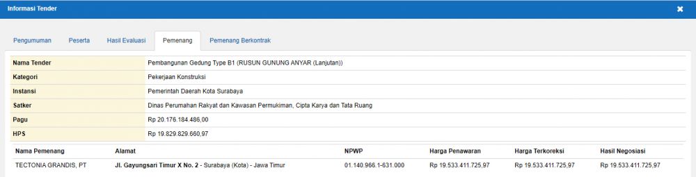 Perlu diketahui, Dinas Perumahan Rakyat dan Kawasan Permukiman, Cipta Karya dan Tata Ruang (DPRKPCKTR) Pemkot Surabaya membuat proyek Rusun Gunung Anyar (Lanjutan) dengan Nilai HPS Paket Rp 19, 8 miliar.