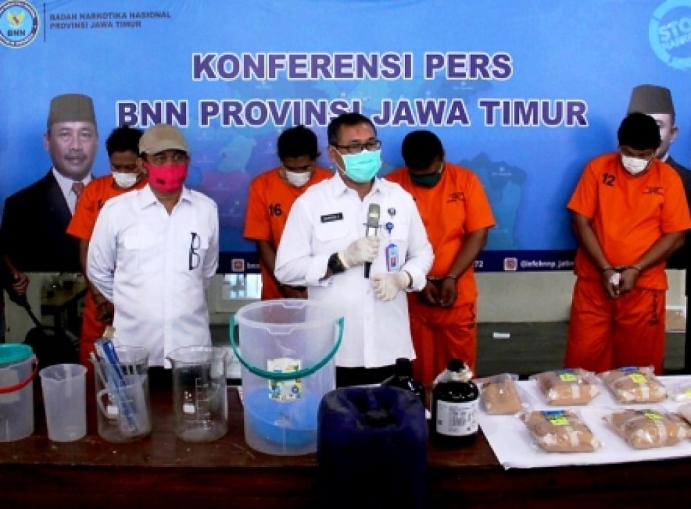 Kabid Pemberantasan BNNP Jatim Arief Darmawan saat jumpa pers mengaku, salah satu yang ditangkap mengedarkan dan memproduksi sau-sabu di wilayah Mijen-Semarang. Pelaku pesebakbola lain hanya menjadi pembeli.