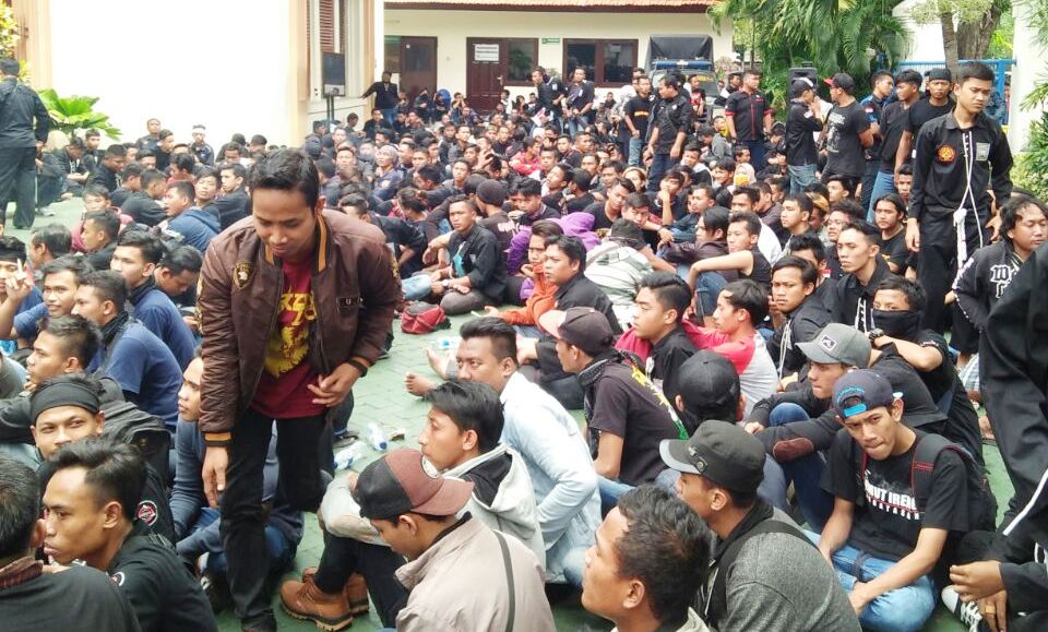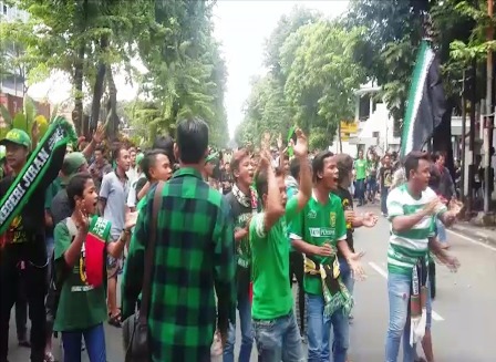 Potretkota.com - Ribuan massa bonek kepung Pengadilan Negeri (PN) Surabaya, Kamis (22/2/2018). Mereka datang dari berbagai daerah guna mengawal dan mendukung rekannya yang jadi pesakitan karena dianggap telah menjadi provokator bentrok terjadinya pembunuhan anggota Persaudaraan Setia Hati Terate (PSHT), Muhammad Anis dan Aris Eko Ristanto.