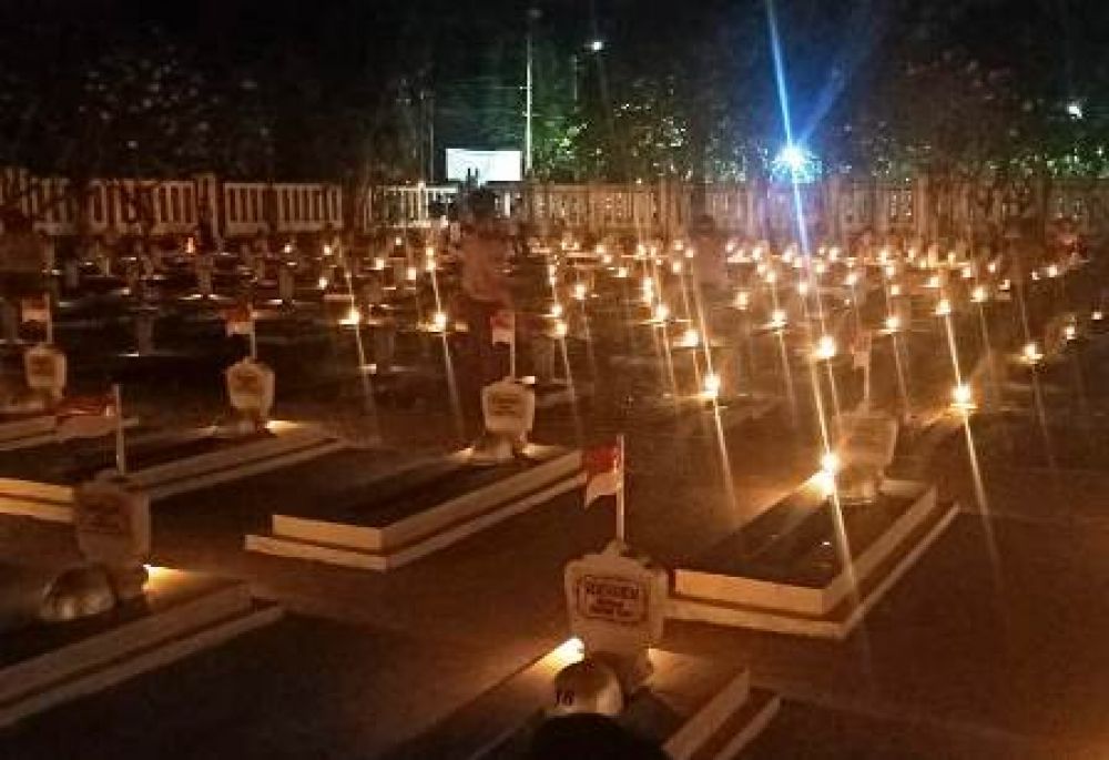 Potretkota.com - Taman Makam Pahlawan Kusuma Negara di Kabupaten Lamongan, Jawa Timur, mendadak dipenuhi ribuan lilin. Suasana gelap pun, seketika menjadi terang dengan adanya lilin yang menghiasi ratusan makam para pahlawan maupun pejuang di TMP Kusuma Negara.