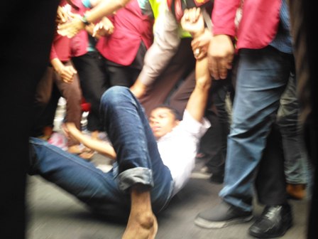 Peringatan ini sama sekali tidak digubris oleh ratusan mahasiswa. Penerus bangsa ini malah kembali ke tengah jalan dan memblokir Jalanan Yos Sudarso Surabaya. Polisi yang geram lalu menghajar mahasiswa. Akibatnya, puluhan para intelektual ini cidera. Koordinator aksi Esradus akhirnya menjalani perawatan di RSUD Dr Soetomo Surabaya. (Tio)