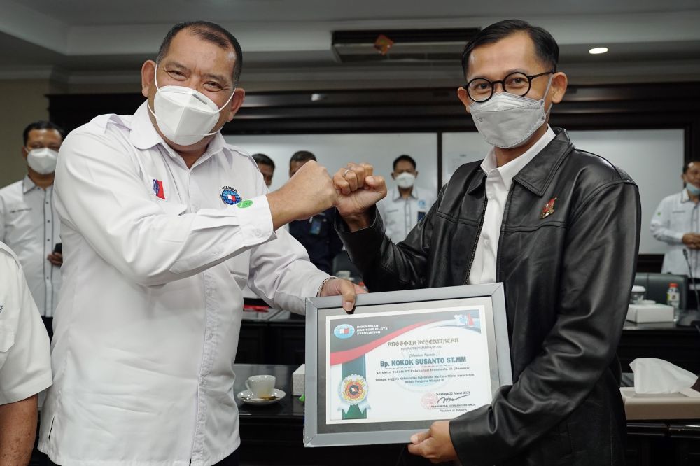 Proses penyematan gelar anggota kehormatan INAMPA kepada jajaran Direksi Pelindo III tersebut diberikan langsung oleh Presiden INAMPA Pasoroan Herman Harianja dalam sela kunjungan rombangan INAMPA di Kantor Pusat Pelindo III, Senin (22/3/2021).