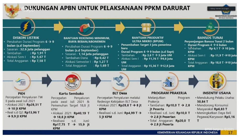 Hal tersebut disampaikan oleh Menteri Keuangan, Sri Mulyani, dalam keterangan pers secara virtual selepas sidang kabinet paripurna yang dipimpin oleh Presiden Joko Widodo pada Senin, 5 Juli 2021.