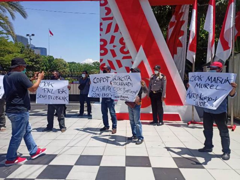 Potretkota.com - Puluhan warga Surabaya, melakukan aksi unjuk rasa di pintu masuk Pemkot Surabaya, Selasa (31/8/2021) siang. Mereka menuntut agar oknum Satpol PP Kota Surabaya, Kabid Ketertiban Umum dan Ketenteraman Masyarakat Piter Frans Rumaseb dan Komandan Bataliyon Wahyu Prasetya Yanottama, dipecat dan dipidankan.
