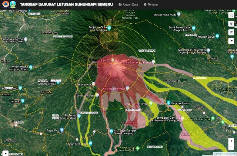 Potretkota.com - Gunung Semeru mengalami peningkatan aktivitas vulkanik yang ditunjukkan dengan terjadinya guguran awan panas mengarah ke Besuk Kobokan, Desa Sapiturang, Kecamatan Pronojiwo, Kabupaten Lumajang, Jawa Timur, pada Sabtu (4/12/2021) pukul 15.20 WIB.
