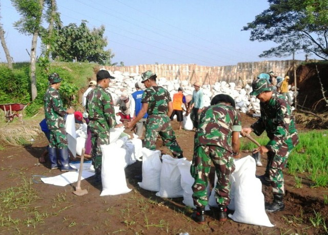 “Rehabilitasi tanggul dilakukan dengan menumpuk karung-karung yang berisikan pasir dan kerikil. Untuk memperkuat tumpukan karung-karung ini, kita pasang patok bambu yang dijepitkan diantara tumpukan dengan gedek. Sudah dapat dipastikan dalam sehari, rehalibitasi tanggul bisa selesai,” jelas Danramil Grogol Kapten Inf Suliyono.