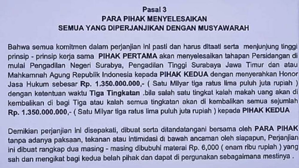 "Dalam perkara itu, Koperasi Sidogiri memberikan fee pengacara Rp 675 juta, Achmad Prihantoyo secara pribadi Rp 675 juta. Total Rp 1,350 miliar," jelas Abdul Majid, Selasa (28/6/2022).