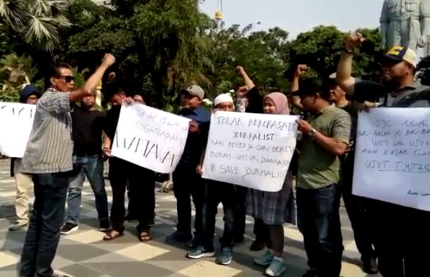 Potrekota.com - Aliansi Wartawan Surabaya (Awas) tadi siang menggelar aksi atas kekerasan yang dialami oleh wartawan media online di Jember Oryza Ardyansah Wirawan, Kamis (5/7/2018). Para wartawan dari berbagai media ini menyerukan jika pekerjaannya di lindungi UU No 40 Tahun 1999 tentang Pers.