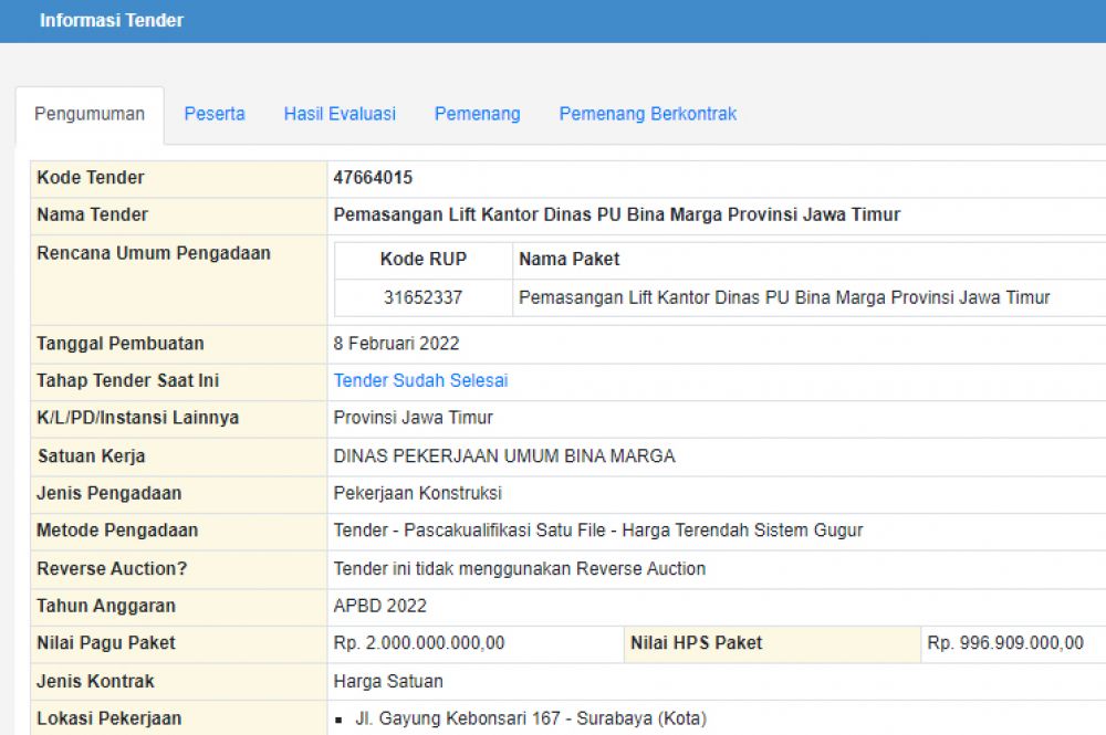 Potretkota.com - Tahun 2022, Dinas Pekerjaan Umum Bina Marga (DPUBM) Pemerintah Provinsi Jawa Timur (Pemprov Jatim) mengalokasikan pengadaan lift, dengan biaya total Rp1 miliar lebih.