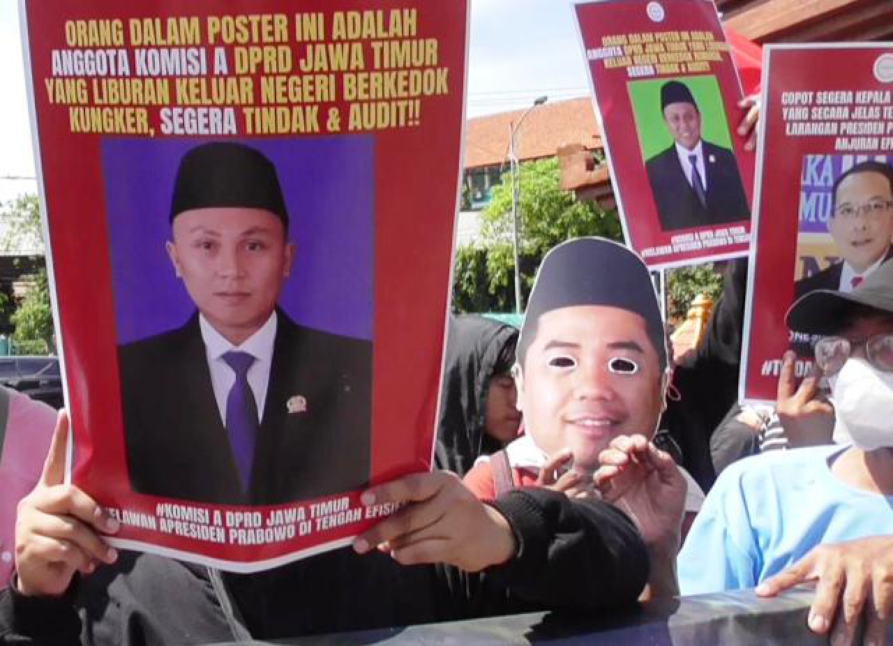 Koordinator Lapangan Aqiyas Sholeh mengatakan, berdasarkan Instruksi Presiden Nomor 1 Tahun 2025 tentang Efisiensi, kegiatan yang dirasa tidak begitu penting seperti Perjalanan Dinas Keluar Negeri atau PDLN sebaiknya tidak dilakukan. Pendemo menilai, PDLN oleh Anggota Komisi A DPRD Jatim merupakan tindakan yang berani melawan dan menabrak Instruksi Presiden tersebut.