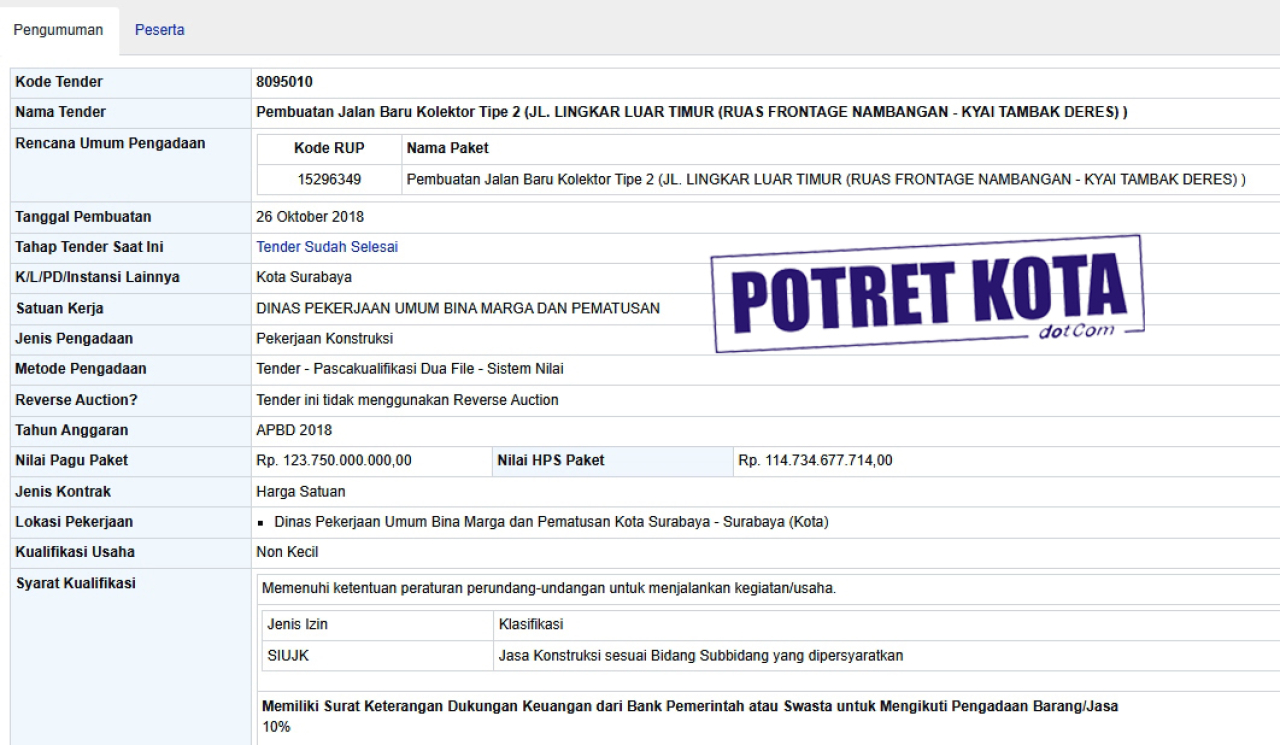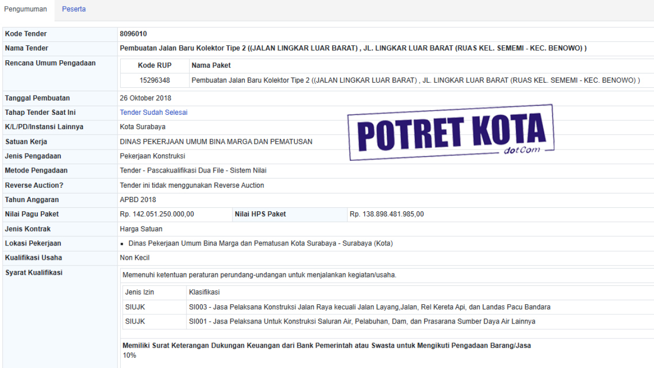 Sayangnya, lelang terbuka yang dibuat oleh Dinas Pekerjaan Umum Bina Marga Dan Pematusan Pemkot Surabaya tersebut terlihat publik kesannya hanya formalitas. Apakah pemenang sudah ditentukan?