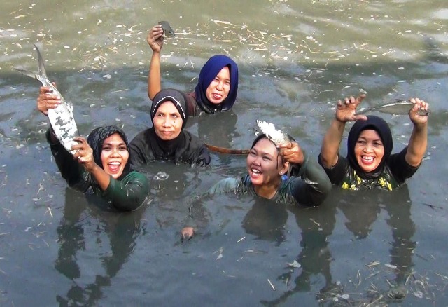 Suti, salah satu peserta terlihat bahagia setelah berhasil menangkap ikan bandeng berukuran besar hanya dengan tangan kosong. “Senang, bisa berbaur dengan peserta lain,” katanya, Minggu (28/10/2018).