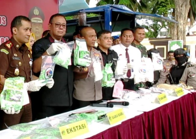 “Kami mengucapkan apresiasi kepada jajaran Polrestabes Surabaya, yang mana dengan cepatnya mengungkap kasus dalam waktu 3 minggu dari 2 kilo menjadi 4 kilo dan sebelumnya juga ada beberapa dalam waktu dua bulan ini luar biasa, ekstasi juga dari 4000 jadi 7000 butir, dan ini pelaku semuanya dikendalikan sistem jaringan terputus, mendapat perintah dan dikendalikan dari Lapas Madiun,” jelas Kapolda Jatim.