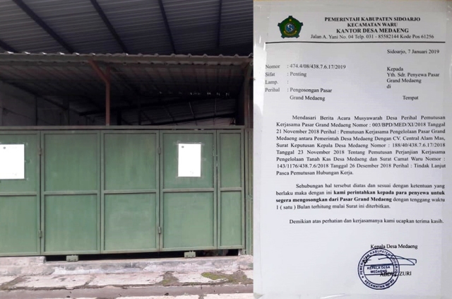Buntut pelaporan, investasi Pasar Grand Medaeng yang dibangun dengan kontrak dari tahun 2011 hingga 2031 dihentikan paksa oleh Pemerintah Desa Medaeng. Alasan pengosongan, karena sudah ada pemutusan kontrak perjanjian kerjasama. “Kami perintahkan kepada para penyewa untuk segera mengosongkan dari Pasar Grand Medaeng,” tulis huruf tebal yang ditandatangani Abdul Zuri. (Tio)